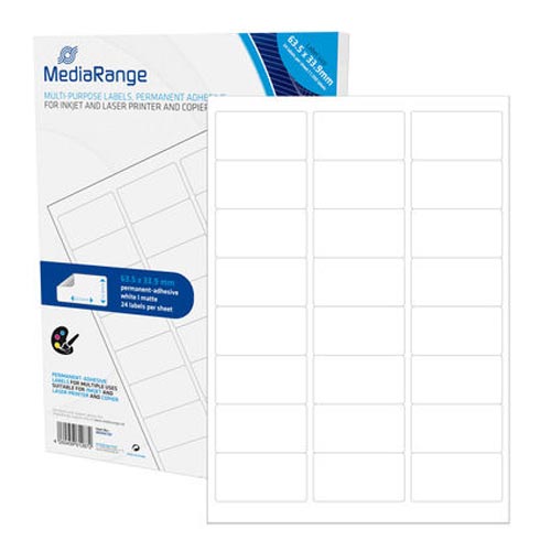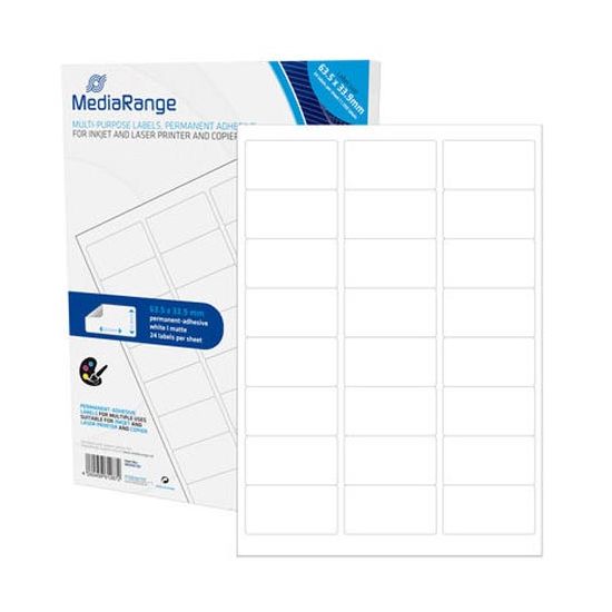 Αυτοκόλλητες ετικέτες πολλαπλών χρήσεων 63,5 x 33,9 mm, λευκές, με μόνιμη κόλλα και ματ επιφάνεια. Κατάλληλες για inkjet, laser εκτυπωτές και φωτοαντιγραφικά. Χρώμα: Λευκό (ματ) Διαστάσεις ετικέτας: 63,5 × 33,9 mm Φύλλα: 50 (DIN A4) Ετικέτες ανά φύλλο: 24 Σύνολο: 1.200 ετικέτες Χαρακτηριστικά: Γρήγορο στέγνωμα, ανθεκτικές, μόνιμη κόλλα Εφαρμογές: Προϊόντα, αρχειοθέτηση, γραφείο
