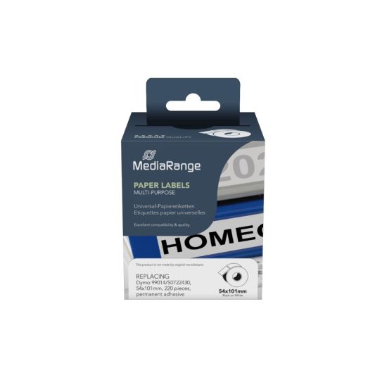Το MediaRange MRDY99014 είναι ρολό με χάρτινες ετικέτες γενικής χρήσης, σχεδιασμένες για εκτυπωτές ετικετών που χρησιμοποιούν το πρότυπο Dymo 99014/S0722430. Οι ετικέτες διαθέτουν μόνιμη κόλλα, είναι άψογα αναγνώσιμες και προσφέρουν εύκολη και γρήγορη αντικατάσταση. Ιδανικές για επαγγελματική και οικιακή χρήση. Βασικά Χαρακτηριστικά: Τύπος: Χάρτινες ετικέτες σε ρολό Συμβατότητα: Dymo 99014 / S0722430 Διαστάσεις ετικέτας: 101 x 54 mm Χρώμα: Μαύρη εκτύπωση σε λευκό φόντο Κόλλα: Μόνιμη Υλικό: Χαρτί Συσκευασία: 1 ρολό με 220 ετικέτες Εφαρμογές: Επαγγελματική σήμανση Οργάνωση γραφείου Αποθήκες και logistics Συμβατοί εκτυπωτές: Dymo LabelWriter 450, 450 Duo, 450 Turbo, 450 Twin Turbo, 4XL, SE450