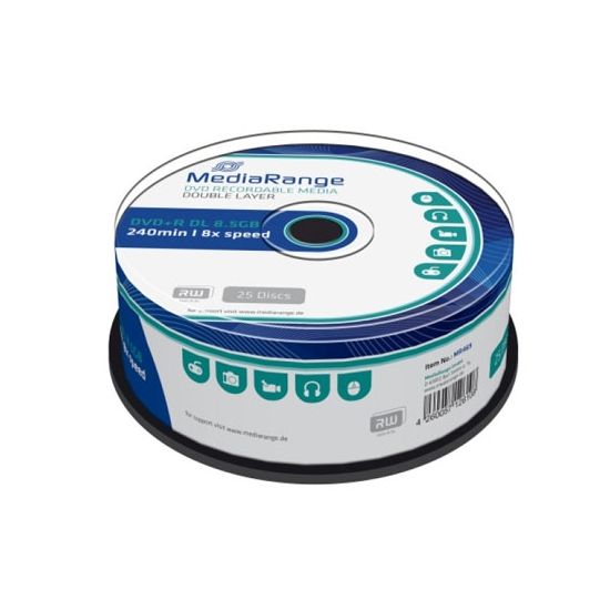 Το MediaRange MR469 είναι πακέτο εγγράψιμων DVD+R Dual Layer, ιδανικό για αποθήκευση μεγάλων αρχείων, ταινιών και backup. Χαρακτηριστικά Τύπος: DVD+R (εγγράψιμο μία φορά) Χωρητικότητα: 8,5 GB (240 λεπτά) Τεχνολογία: Dual Layer (διπλή στρώση για διπλάσια χωρητικότητα) Ταχύτητα εγγραφής: έως 8x Συσκευασία: Cake Box 25 τεμαχίων Επιφάνεια: MediaRange branded (όχι printable) Συμβατότητα: Με όλους τους DVD burners και players Πλεονεκτήματα: Ιδανικό για αποθήκευση βίντεο υψηλής ποιότητας Μακροχρόνια αρχειοθέτηση Ανθεκτικότητα σε UV ακτινοβολία και γρατζουνιές