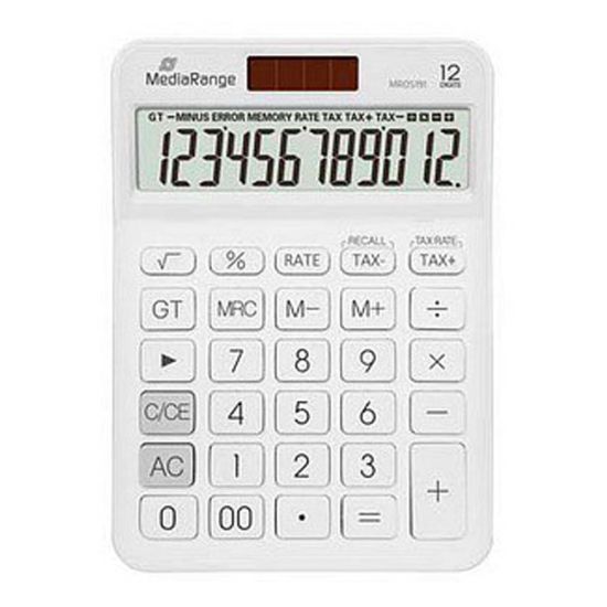 MediaRange Αριθμομηχανή με λειτουργία υπολογισμού φόρου, LCD 12 ψηφίων, με ηλιακή και μπαταρία, λευκή ΧΑΡΑΚΤΗΡΙΣΤΙΚΑ Αριθμομηχανή με λειτουργία υπολογισμού φόρου Οθόνη LCD 12 ψηφίων Διπλή τροφοδοσία: Ηλιακή και με μπαταρία DC 1.5V⎓1x L1131 αλκαλική μπαταρία κουμπί Μεγάλη, κεκλιμένη οθόνη 35° υψηλής αντίθεσης, διαστάσεων 120 x 27 mm Κομψός σχεδιασμός Άνετα, εργονομικά πλαστικά πλήκτρα Λειτουργίες: υπολογισμός φόρου, γενικό σύνολο, μνήμη 3 πλήκτρων, διπλό μηδέν, τετραγωνική ρίζα και ποσοστά Αυτόματη απενεργοποίηση μετά από 8 λεπτά Διαστάσεις: 126 x 175 x 31 mm Βάρος: ± 170g Χρώμα: λευκό ΕΦΑΡΜΟΓΕΣ Ιδανική για υπολογισμούς φόρου Κατάλληλη για γραφείο, επαγγελματική χρήση, σχολείο, καταστήματα και οικιακή χρήση