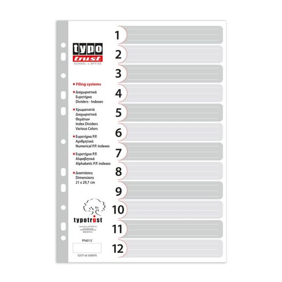 Διαχωριστικά φτιαγμένα από PP. Διάσταση Α4, με 11 πλαινές οπές για να μπορούν να τοποθετηθούν σε όλους τύπους ντοσιέ και κλασέρ της αγοράς. Τα διαχωριστικά σου επιτρέπουν να χωρίζεις τα θέματα ανά χρώμα, αλφαβητικά, αριθμητικά ή με τον μήνα και να τα βρίσκεις με μια γρήγορη ματιά. Η μπροστινή σελίδα της κάθε συσκευασίας είναι προτυπωμένη με γραμμές για την αναγραφή των περιεχομένων.