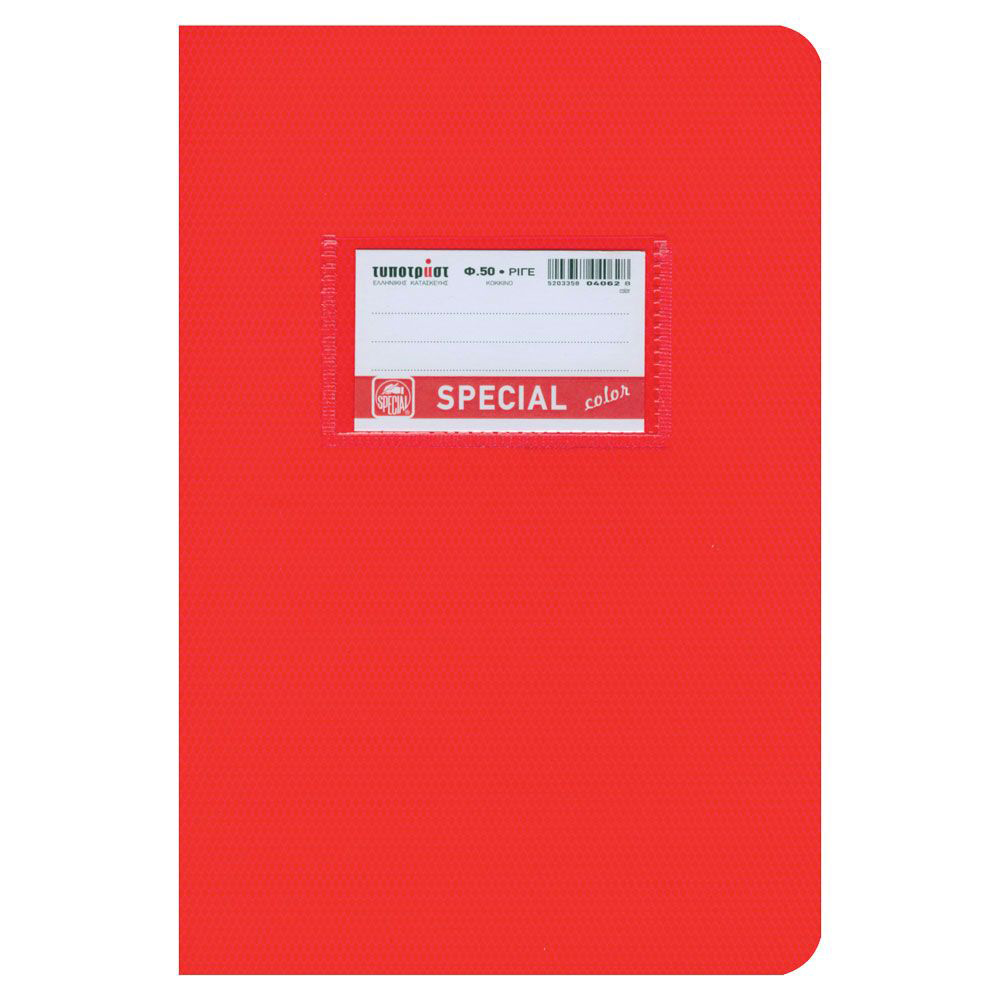 Κλασικό Special Τετράδιο 50 φύλλων, διάστασης B5 (17x25) με χρωματιστό ανάγλυφο πλαστικό εξώφυλλο. Τα φύλλα είναι από εξαιρετικής ποιότητας χαρτί 70γρ. και η γραμμογράφηση είναι ριγέ με σωστές αποστάσεις. Έχει στρογγυλεμένες γωνίες και προεκτυπωμένη ετικέτα 2 όψεων σε ματ χαρτί η οποία βγαίνει εύκολα χάρη στην εγκοπή. Διατίθεται σε 13 χρώματα (μαύρο, κόκκινο, πράσινο, μωβ, κίτρινο, πορτοκαλί, λαχανί, φούξια, γαλάζιο, γκρι, βεραμάν, μπορντώ, λευκό).