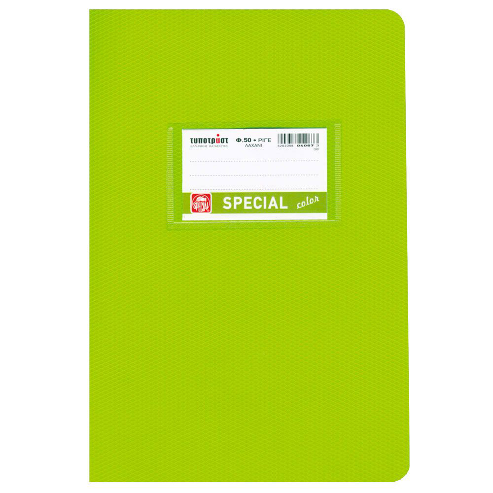 Κλασικό Special Τετράδιο 50 φύλλων, διάστασης B5 (17x25) με χρωματιστό ανάγλυφο πλαστικό εξώφυλλο. Τα φύλλα είναι από εξαιρετικής ποιότητας χαρτί 70γρ. και η γραμμογράφηση είναι ριγέ με σωστές αποστάσεις. Έχει στρογγυλεμένες γωνίες και προεκτυπωμένη ετικέτα 2 όψεων σε ματ χαρτί η οποία βγαίνει εύκολα χάρη στην εγκοπή. Διατίθεται σε 13 χρώματα (μαύρο, κόκκινο, πράσινο, μωβ, κίτρινο, πορτοκαλί, λαχανί, φούξια, γαλάζιο, γκρι, βεραμάν, μπορντώ, λευκό).
