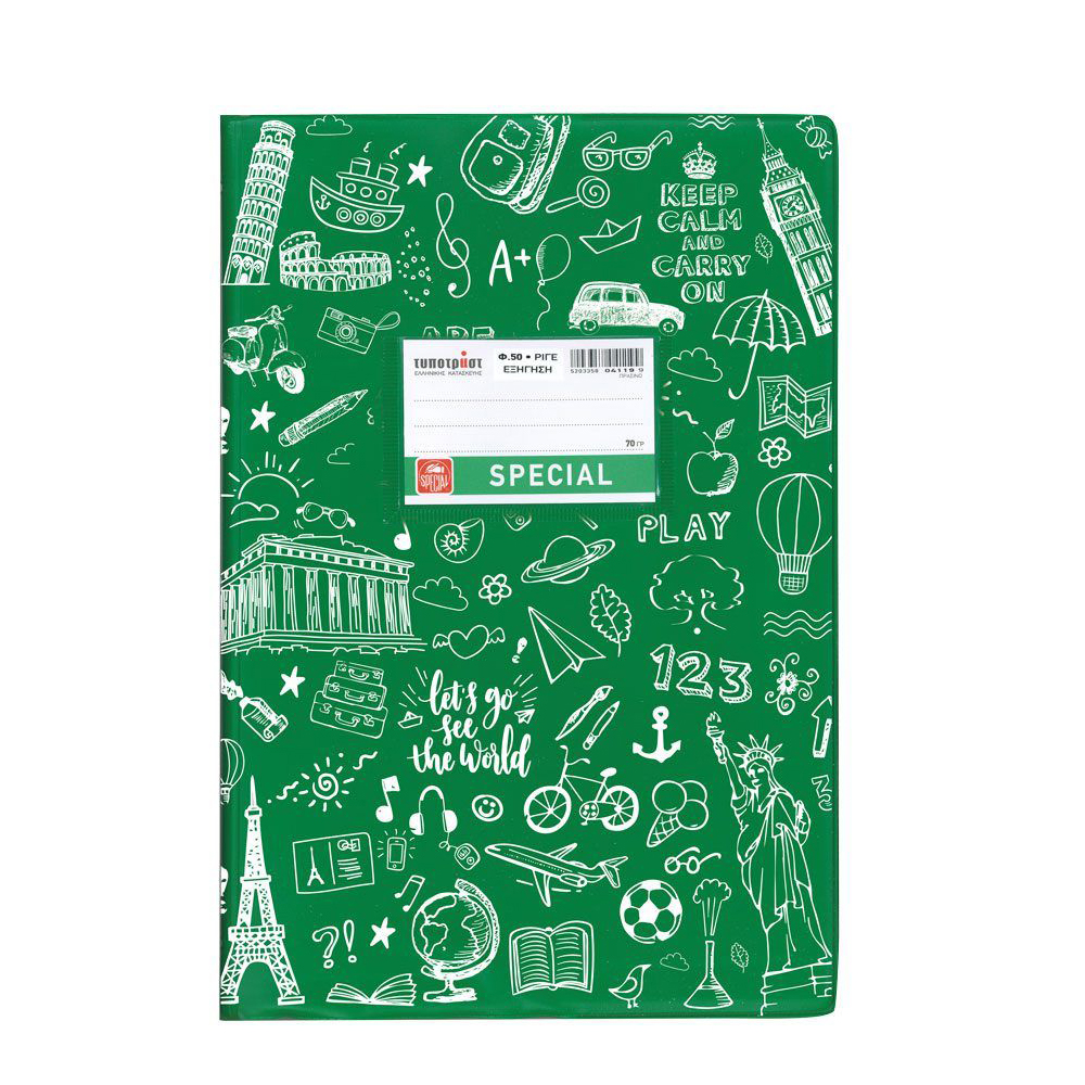 Doodle εξήγηση εύκαμπτη με περαστή θήκη. Special Τετράδιο 50 φύλλων, διάστασης B5 (17x25). Το εξώφυλλο είναι χρωματιστό με σχέδια για να ξεχωρίζει το κάθε μάθημα εύκολα. Τα φύλλα είναι από εξαιρετικής ποιότητας χαρτί 70γρ. και η γραμμογράφηση είναι ριγέ με σωστές αποστάσεις. Έχει προεκτυπωμένη ετικέτα 2 όψεων σε ματ χαρτί η οποία βγαίνει εύκολα χάρη στην εγκοπή και στρογγυλεμένες γωνίες. Διατίθεται σε 9 χρώματα (σκούρο μπλε, κόκκινο, πράσινο, μωβ, κίτρινο, πορτοκαλί, λαχανί, φούξια, γαλάζιο), σε πακέτο των 6 τεμαχίων.