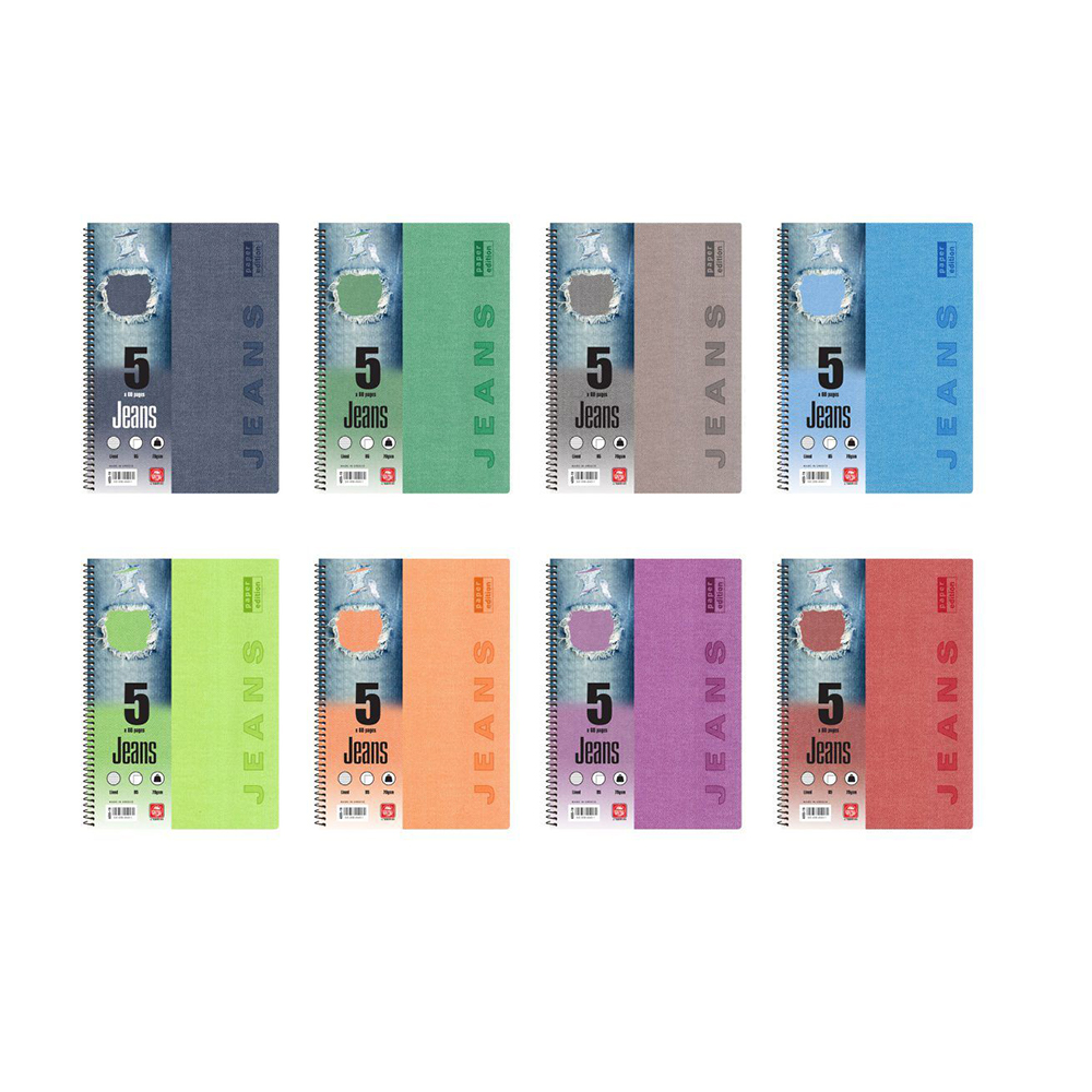 To αυθεντικό Jean Τετράδιο σπιράλ. Με εξώφυλλο τύπου “Denim” 350 γρ. που δίνει την αίσθηση υφάσματος και με σκληρό οπισθόφυλλο για να μπορείς να γράφεις σταθερά. Τα φύλλα είναι από εξαιρετικής ποιότητας χαρτί 70γρ. και η γραμμογράφηση είναι ριγέ με σωστές αποστάσεις. Έχουν διαχωριστικό για μεγαλύτερη ευκολία. Διατίθεται σε 8 χρώματα (κόκκινο, σκούρο μπλε, πράσινο, μωβ, γαλάζιο, πορτοκαλί, λαχανί, γκρι). Η συσκευασία είναι ανάμεικτων χρωμάτων (τυχαία επιλογή).