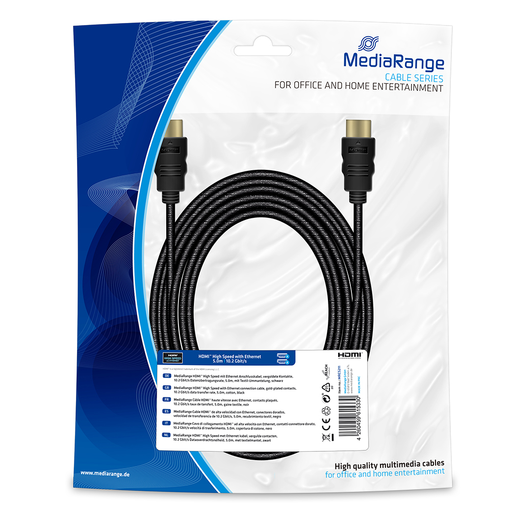 Το MediaRange MRCS211 είναι καλώδιο HDMI™ High Speed με Ethernet, μήκους 5 μέτρων, σχεδιασμένο για αξιόπιστη μετάδοση εικόνας και ήχου υψηλής ευκρίνειας. Διαθέτει επίχρυσες επαφές για βέλτιστη αγωγιμότητα και ανθεκτική βαμβακερή επένδυση για μεγαλύτερη διάρκεια ζωής. Ιδανικό για σύνδεση συσκευών όπως τηλεοράσεις, Blu-ray players, κονσόλες παιχνιδιών και υπολογιστές. Βασικά Χαρακτηριστικά: Τύπος: HDMI™ High Speed με Ethernet Έκδοση: HDMI 1.4 Μήκος: 5,0 m Χρώμα: Μαύρο Υλικό επένδυσης: Βαμβακερή επένδυση (cotton coated) Αγωγός: AWG 30 (διάμετρος 0,255 mm) Ρυθμός μεταφοράς δεδομένων: έως 10,2 Gbit/s Υποστηριζόμενες λειτουργίες: Full HD 1080p 3D Video ARC (Audio Return Channel) Ethernet Channel Deep Color και x.v.Color Ακροδέκτες: HDMI Type A (Male to Male), επίχρυσοι Σχήμα καλωδίου: Στρογγυλό, τριπλά θωρακισμένο Εγγύηση: 2 έτη