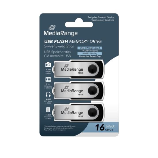 USB Flash Memory Drive MediaRange USB 2.0 με περιστρεφόμενο μεταλλικό περίβλημα, Ασημί/Μαύρο, 3 τεμάχια x 16GB Αξιόπιστη αποθήκευση για καθημερινή χρήση Η MediaRange προσφέρει αξιόπιστες λύσεις αποθήκευσης για καθημερινές ανάγκες. Οι μονάδες USB flash είναι ιδανικές για δημιουργία αντιγράφων ασφαλείας, μεταφορά και κοινή χρήση αρχείων, προσφέροντας σταθερή απόδοση σε συμπαγές μέγεθος. Το σετ MR910-3 περιλαμβάνει τρεις μονάδες USB 2.0 των 16GB, με περιστρεφόμενο μεταλλικό περίβλημα για προστασία και ευκολία στη χρήση. Είναι συμβατές με όλα τα σύγχρονα λειτουργικά συστήματα και έτοιμες για χρήση χωρίς εγκατάσταση (Plug & Play). ΧΑΡΑΚΤΗΡΙΣΤΙΚΑ: Μοντέλο: USB 2.0 Flash Memory Drive Χωρητικότητα: 16 GB ανά μονάδα (3 τεμάχια) Διασύνδεση: USB 2.0 Ταχύτητα ανάγνωσης: Έως 17 MB/s Ταχύτητα εγγραφής: Έως 6 MB/s Χρώμα: Ασημί/Μαύρο Υλικό: Μεταλλικό περιστρεφόμενο περίβλημα Διαστάσεις: Περίπου 18 x 10 x 56 mm Καθαρό βάρος: Περίπου 12g Συσκευασία: Blister pack με 3 τεμάχια Συμβατότητα: Windows, macOS, Linux Άλλο: Μακροχρόνια διατήρηση δεδομένων ΕΦΑΡΜΟΓΕΣ: Συνηθισμένες χρήσεις: Εκπαίδευση: Αποθήκευση και μεταφορά σημειώσεων και εργασιών Επιχειρήσεις: Μεταφορά παρουσιάσεων και σημαντικών εγγράφων με ασφάλεια Προσωπική χρήση: Δημιουργία αντιγράφων ασφαλείας και μεταφορά φωτογραφιών, βίντεο και αρχείων
